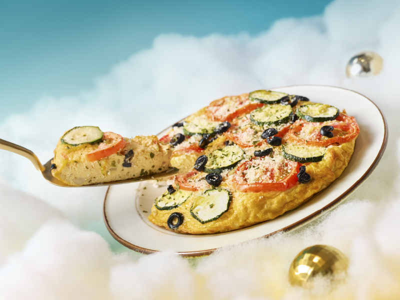 金黃厚實的蛋香中融入乳酪絲與蔬菜,表層鋪上櫛瓜、牛番茄與黑橄欖烘烤後散發濃郁奶香與蔬菜清甜,層層堆疊出豐富的地中海風味。