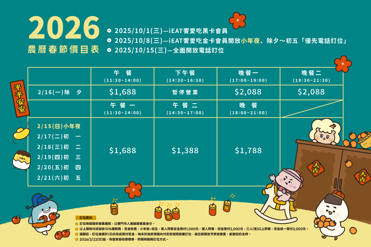 4.2026/2/22(日)起,恢復常態收費標準、用餐時間與訂位方式。