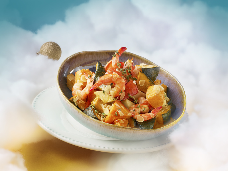 選用香甜南瓜為基底,加入Q彈藍鑽蝦,並以焙煎胡麻醬輕拌後,撒上香烤杏仁片,視覺繽紛、味覺多層次,品嚐秋冬時節的濃郁溫潤。