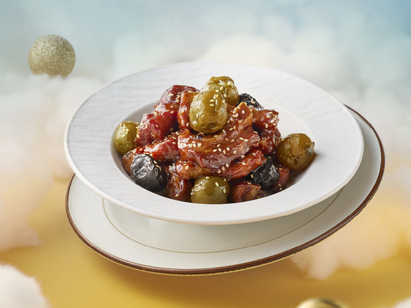 上等排骨高溫油炸至香酥後,裹上酸甜誘人的梅汁醬後,以整顆煙燻烏梅、脆梅點綴。梅香果韻交融,酸甜而不膩口,饕客必嚐!