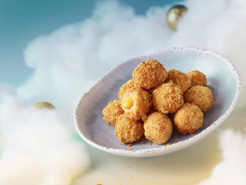 以新鮮魚漿與蝦漿揉製成餡後,包入濃醇起司,外層裹覆米香炸至金黃酥脆,入口瞬間,鮮香與奶香交織綻放。