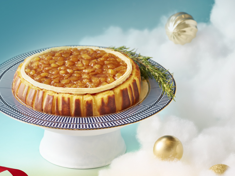 肉桂焦糖蘋果與乳酪濃醇奶香完美融合,巴斯克蛋糕體細緻且濕潤,口感柔軟而綿密,層層堆疊出甜鹹交織的果香香氣。