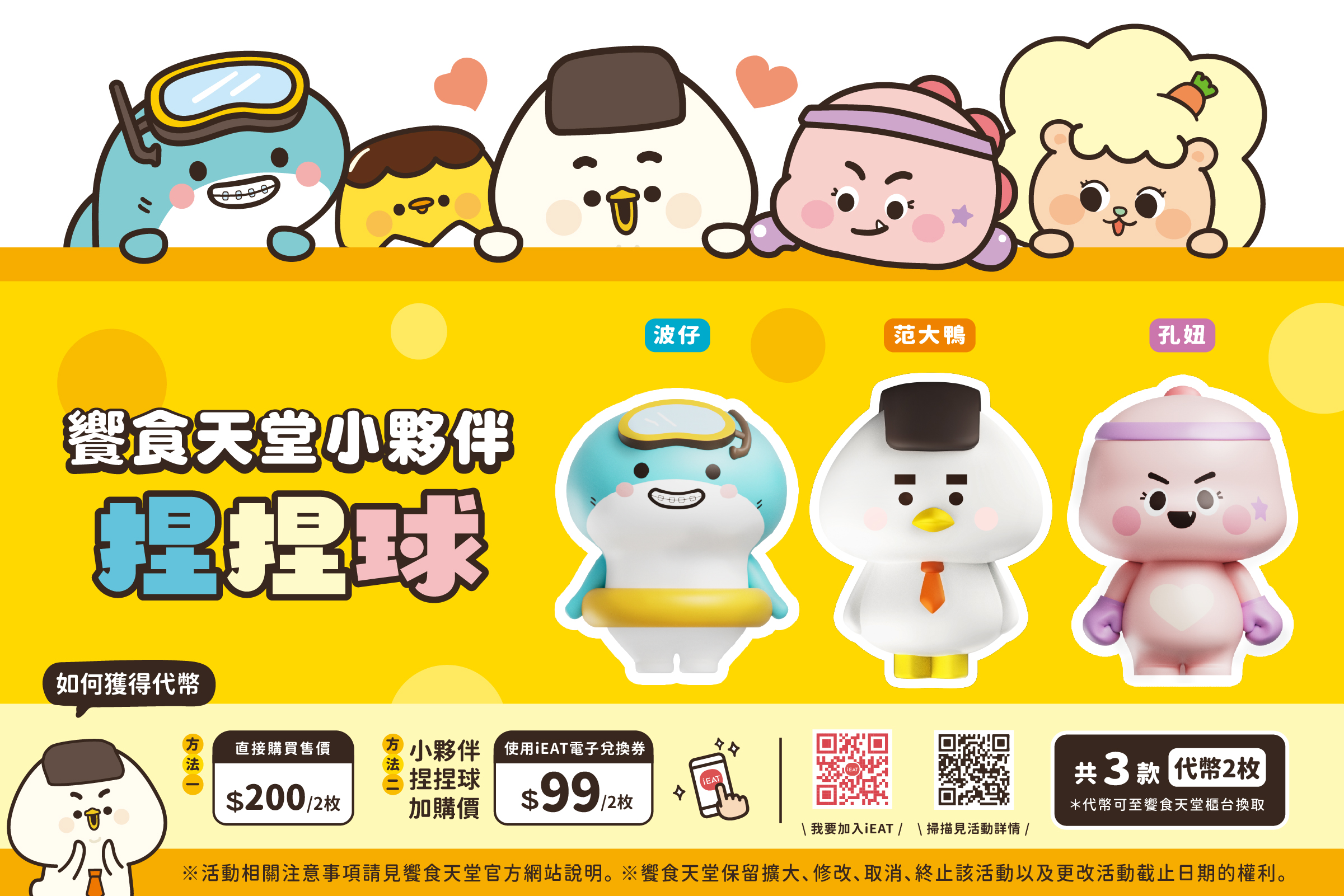 3.本優惠兌換限於饗食天堂全台門市,內用消費即可以99元優惠價加購「饗食小夥伴-造型捏捏球 扭蛋代幣」兩枚,當日不限兌換次數。造型捏捏球款式為扭蛋機隨機轉出,恕不得指定款式。