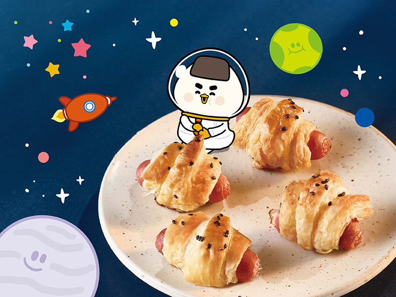 熱狗捲入酥皮後熱熱烘烤,表層刷上蛋液、灑上黑芝麻,酥酥脆脆!我還要再吃一個!